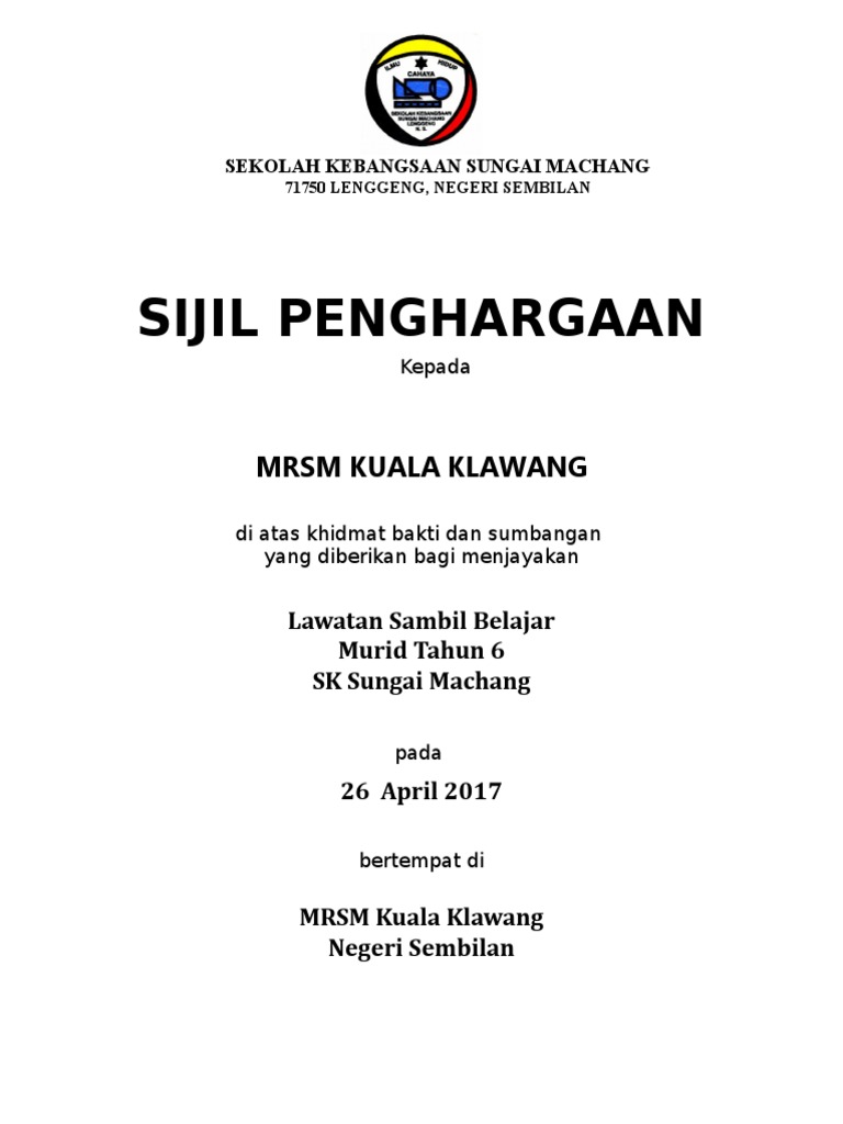 Sijil penghargaan ini amat bermakna kerana ia menunjukkan penghargaan tidak berbelah bahagi KPM terhadap jasa dan pengorbanan guru yang bertungkus lumus berusaha. Guru-guru hanya perlu edit mengikut kesesuaian ayat menukar logo dan nama sekolah. Taklimat Penerima Biasiswa Bkp.